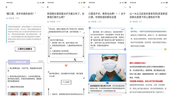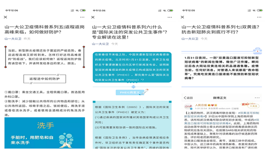 三是在公司公众号---山一大公卫推出疫情科普系列文章,通过新媒体阵地对新型冠状病毒肺炎防控知识进行宣传。突出规范性、权威性、实用性、时效性,第一时间传播权威部门发布的相关信息,科学宣传疫情防护知识,提高广大群众自我保护意识。结合时事热点事件,有针对性地进行解疑释惑和科学辟谣。对重大公共卫生事件中一些常见的心理状况,应该如何理解和应对,心理危机干预有哪些难点、如何展开等,进行了详细分析。目前已连续推出7篇疫情科普系列文章,近万人次转发、阅读相关文章,在师生群众中引发热烈反响。