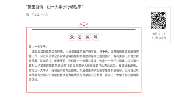 按照山东省教育厅以及校(院)党委的统一部署,成立公司疫情防控工作领导小组,分工负责,责任到人。在全校率先通过公司公众号---山一大公卫,向师生发出倡议:要求全院上下坚定信心、注重防控,主动承担医学专业职责使命,运用自己所学的专业知识和健康教育技能为疫情防控贡献自己的力量。