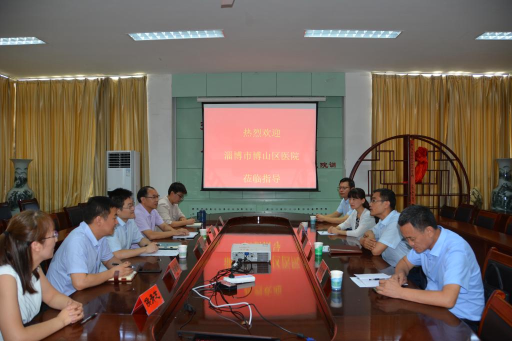 史卫峰首先对客人的到来表示非常欢迎,就公共卫生公司的发展历程、团队力量、专业建设、科研情况以及员工培养等方面进行了简单介绍,尤其是结合当下公司正在进行的一流团队建设,提出了公司发展的宏伟蓝图。随后,何晋杰介绍了博山区医院的历史沿革、医疗体系、诊疗规模、科学研究、医联体建设等情况。双方在公共卫生服务合作、大数据转化、医卫结合、临床医护的公共卫生培训、员工见习实习等多个方面进行了广泛而深入的讨论与交流,达成了高度一致的建设性意见,为下一步签订实践教学基地奠定了良好的基础。