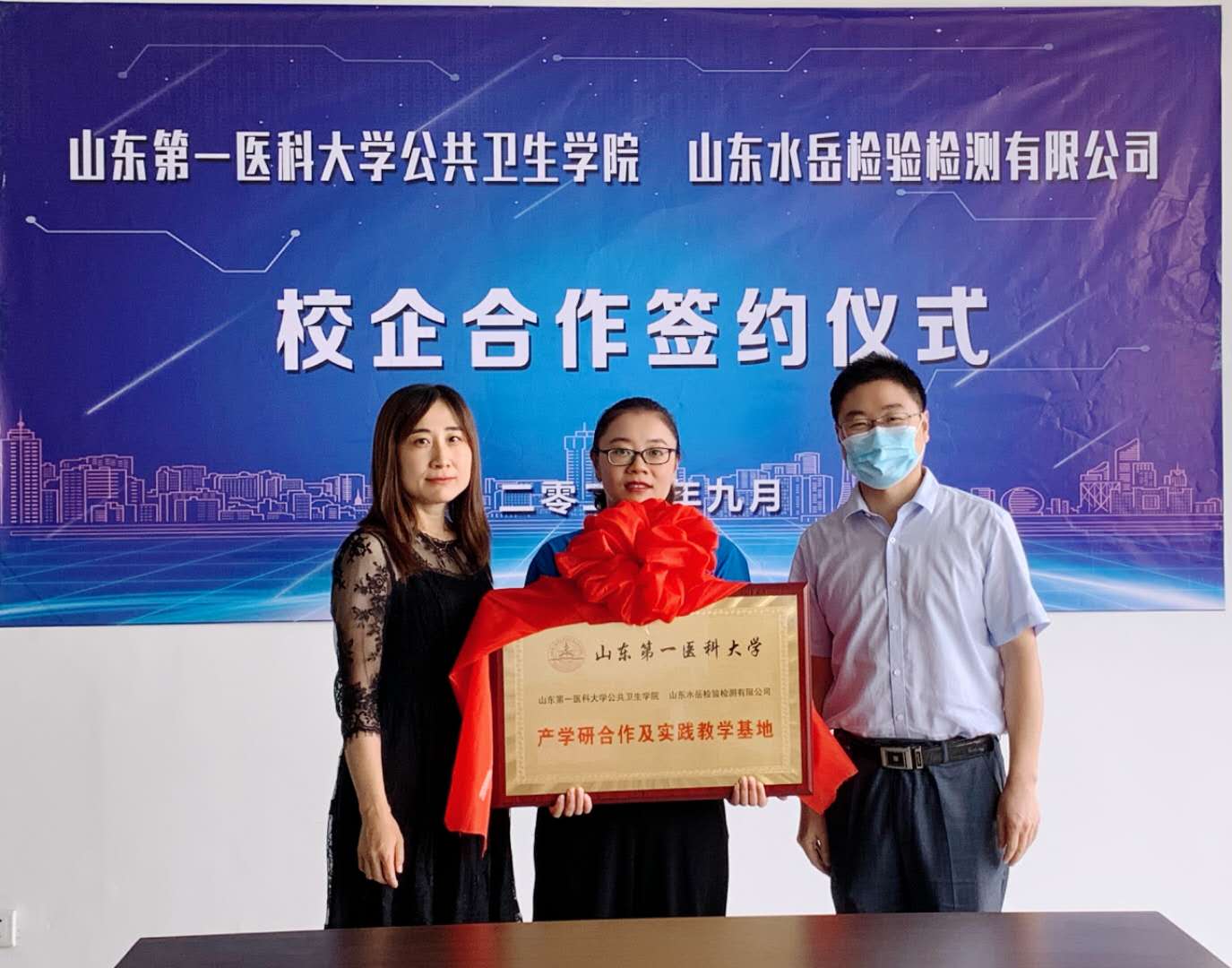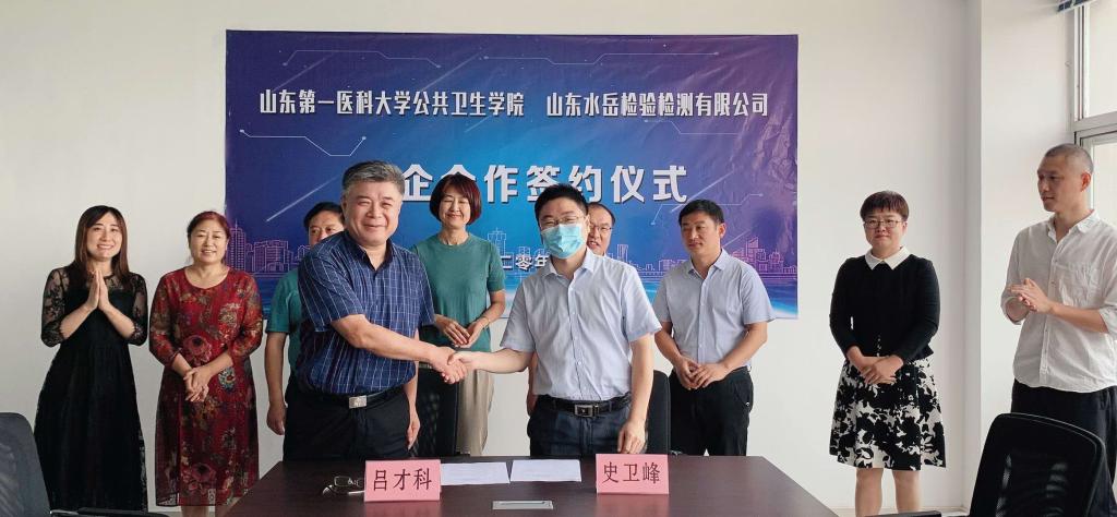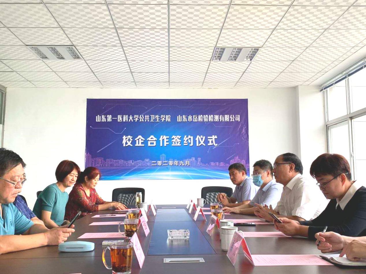 9月22日,公共卫生公司经理史卫峰、书记王君林一行四人到山东水岳检验检测有限公司,参加双方产学研合作及实践教学基地揭牌仪式。