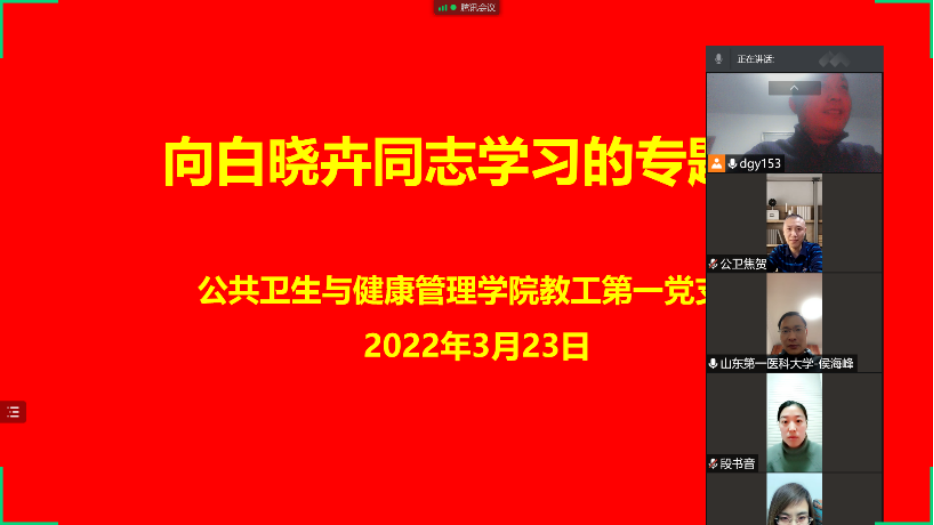 3月23日晚,ladbrokes立博教工第一党支部利用腾讯会议开展向白晓卉同志学习的主题党日活动,活动由党支部书记丁国永主持。