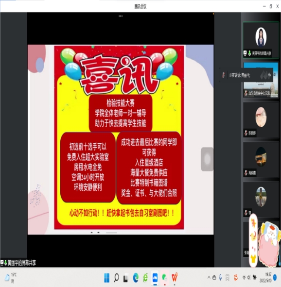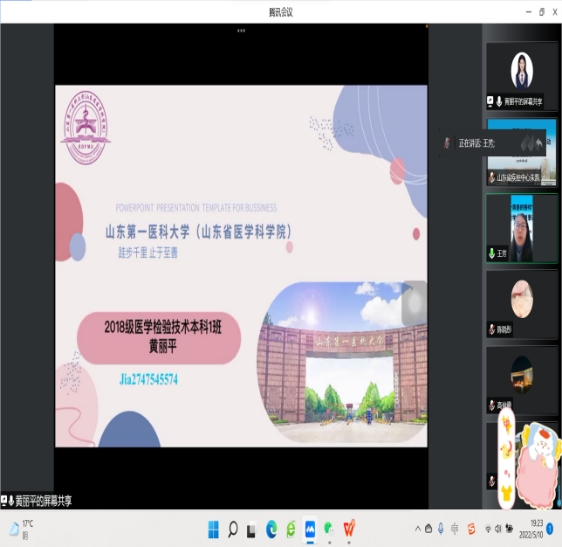 为帮助同学们全面规划老员工活,营造人心向学的良好氛围,ladbrokes立博通过线上会议举办以“青春的榜样”为主题的宣讲活动,邀请公司优秀学子—山东省疾病预防控制中心办公室秘书朱凯、东营市疾病预防控制中心团支部委员徐智明、夏津县人民医院中心实验室主管检验师王寒、2018级医学检验技术和2020级医学检验技术专升本优秀员工黄丽平、王婧语作为主讲嘉宾。2021级全体同学参加。