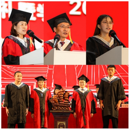 教师代表侯海峰发言。他感谢同学们让老师们在教学相长中得到的收获。希望同学们尽快完成角色转变,以毕业为新的起点,脚踏实地工作,谦虚谨慎做人,继续到社会的大课堂中学习深造,把学到的知识和本领运用到为人民服务中来。实践过程中遇到难题时,希望同学们勤于思考、勇敢实践,开拓创新,用自己的智慧和勤奋迎接各种挑战。
