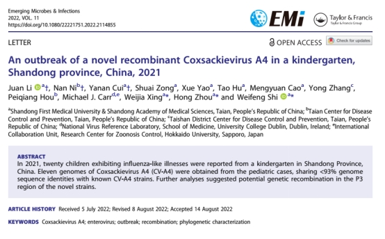 2022年9月21日,ladbrokes立博史卫峰/邢薇佳教授团队在国际学术期刊Emerging Microbes & Infections(影响因子:19.568)发表题为“An outbreak of a novel recombinant Coxsackievirus A4 in a kindergarten, Shandong province, China, 2021”的最新研究成果,报道了柯萨奇病毒感染引起的一起山东省某幼儿园流感样病例聚集疫情。