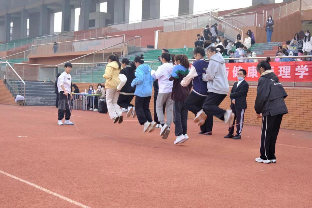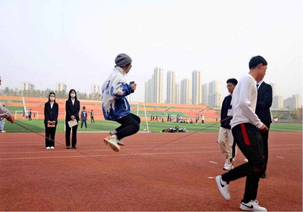 中场过后,一声哨响,跳大绳比赛开始。同学们腾空而起,步伐整齐划一,飞扬的头发见证彼此的默契,团魂在此项目中体现的淋漓尽致。