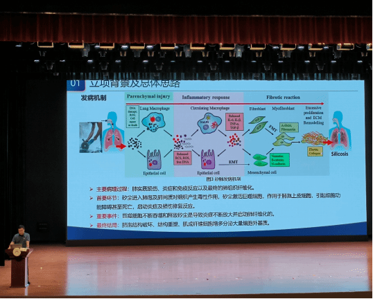杜忠君向同学们介绍了“间充质干细胞治疗矽肺纤维化”学术研究,介绍了尘肺病的发病机理和目前我国尘肺病现状,重点介绍了干细胞在治疗尘肺病方面的应用,详细介绍了脂肪间充质干细胞和骨髓间充质干细胞两种治疗方法的治疗机理、过程和效果。同时,他还强调不同的微环境对干细胞命运的不同影响,可以通过预调矽肺炎症微环境联合干细胞可以有效改善矽肺治疗。