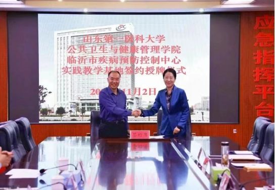 11月2日,公司党委书记王君林、副经理徐希柱一行4人赴临沂市疾病预防控制中心举行实践教学基地签约挂牌仪式。临沂市卫健委党组副书记、市疾控中心党委书记黄颖,市疾控中心党委副书记、主任左慧彬出席会议。