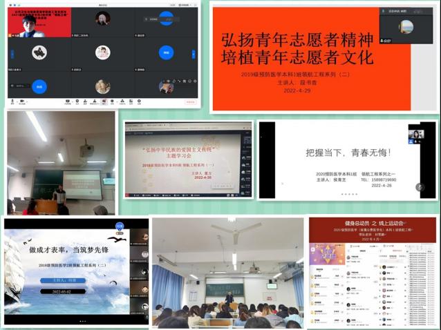 4月17日范华老师利用腾讯会议与2021级预防医学本科2班开展思想交流活动,倾听员工诉求,解答员工疑惑。4月19日焦贺老师走进教室,同2020级预防医学本科2班员工开展“解放思想、实事求是”主题班会,结合员工目前管控带来的焦虑和烦恼,与员工充分讨论正面引导。4月25日邓阳老师在教学南楼C1005与2019级预防医学本科2班员工开展“弘扬青年志愿者精神,培植青年志愿者文化”主题学习会,加强了员工志愿服务精神,号召员工用实际行动彰显新时代老员工的担当和作为。4月26日侯青芝老师利用腾讯会议与对接班级2020级预防医学本科1班开展“把握当下,青春无悔”的主题班会,鼓励同学们要规划好自己的理想,珍惜青年,实现自我价值。4月29日刘雪娜老师线上组织对接班级2020级预防医学(省属公费医员工)本科1班开展“健身总动员·之·线上运动会”,拉进了师生间距离,激发了员工疫情期间锻炼热情,进一步丰富员工课间生活。4月29日段书音老师与2019级预防医学本科1班开展了“弘扬青年志愿者精神,培植青年志愿者文化”的主题班会,培养了员工良好的社会公德和高尚的道德品质,让同学们在志愿服务当中增长见识,感受到服务他人的幸福和快乐,为以后报效社会做好准备。4月30日董方老师利用腾讯会议与2018级预防医学本科1班开展“弘扬中华民族的爱国主义传统”主题学习会,号召同学们将自己的理想和学习融入到社会现代化的建设中,知国、爱国、报国,立志为祖国的建设事业尽自己所有的力量。5月2日何倩老师利用腾讯会议与2018级预防医学本科2班开展“做成才表率,当筑梦先锋”主题学习会,通过活动提高了员工学习的积极性,增加了员工交流沟通能力,明确了应加强新时期老员工自身素质建设,适应当今社会的人才需求。
