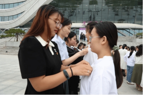 本次活动分为佩戴党徽和入党宣誓两个环节。首先是毕业生党员为预备党员佩戴党徽,一枚枚党徽,寓意着传承,希望预备党员将理想与信念传承下去,在今后的工作和学习中再接再厉,进一步增强党员的身份意识和责任意识,发挥先锋模范作用,以党员的标准严格要求自己,努力向一名合格党员迈进,让党徽在奋发向上和责任担当中闪耀。